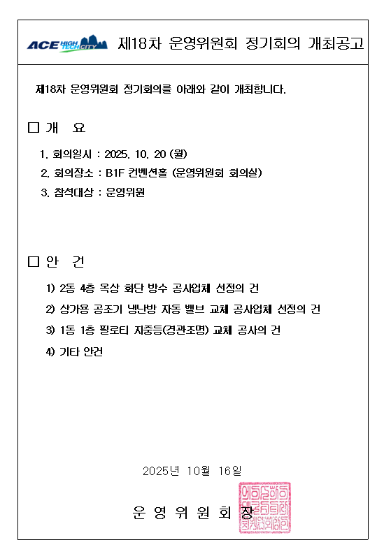 | 다음 글 | 제17차 운영위원회 정기회의 개최공고 | 업무지원센터 | 2025-09-11 |