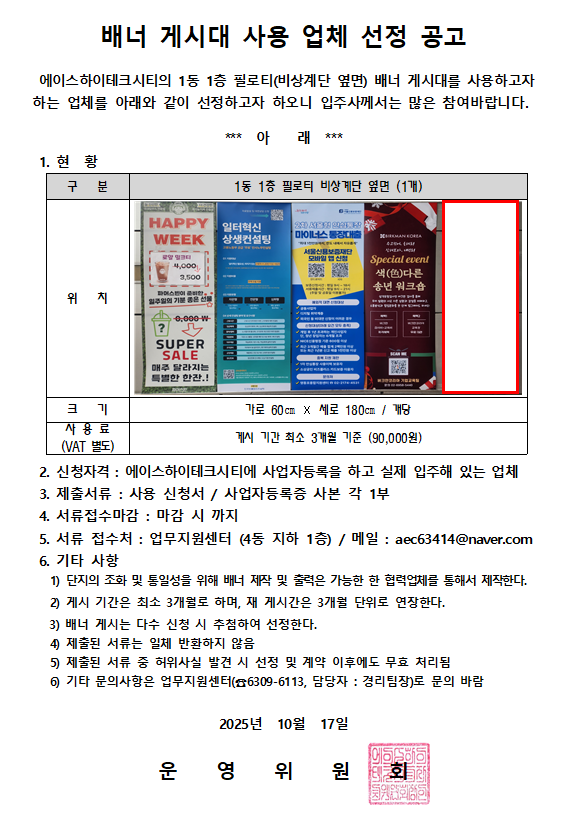 | 제목 | 배너게시대 사용업체 선정 공고 | ||